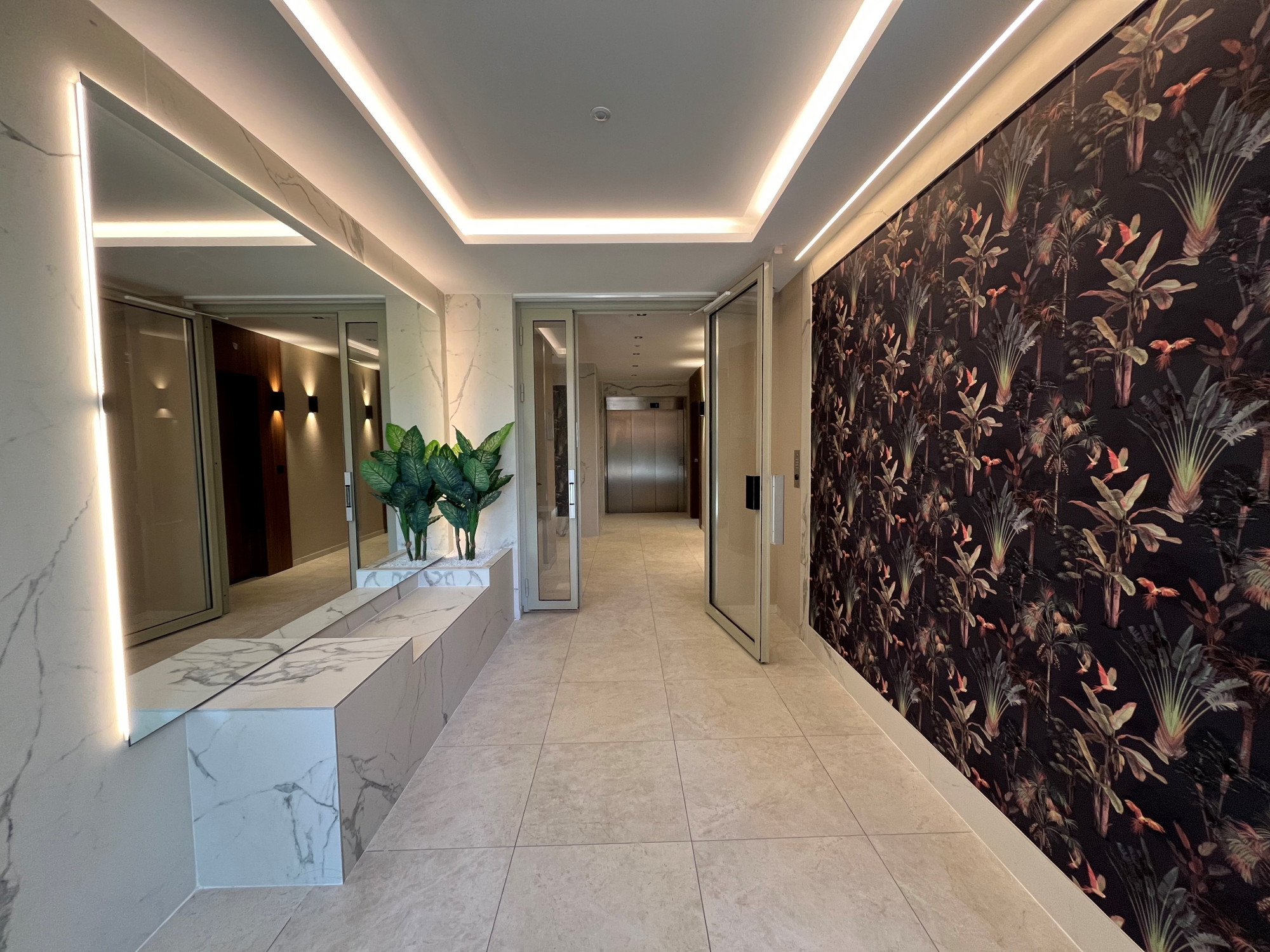 Paliers avec carrelage en grès, revêtement mural Texdecor*, peinture décorative et appliques murales.