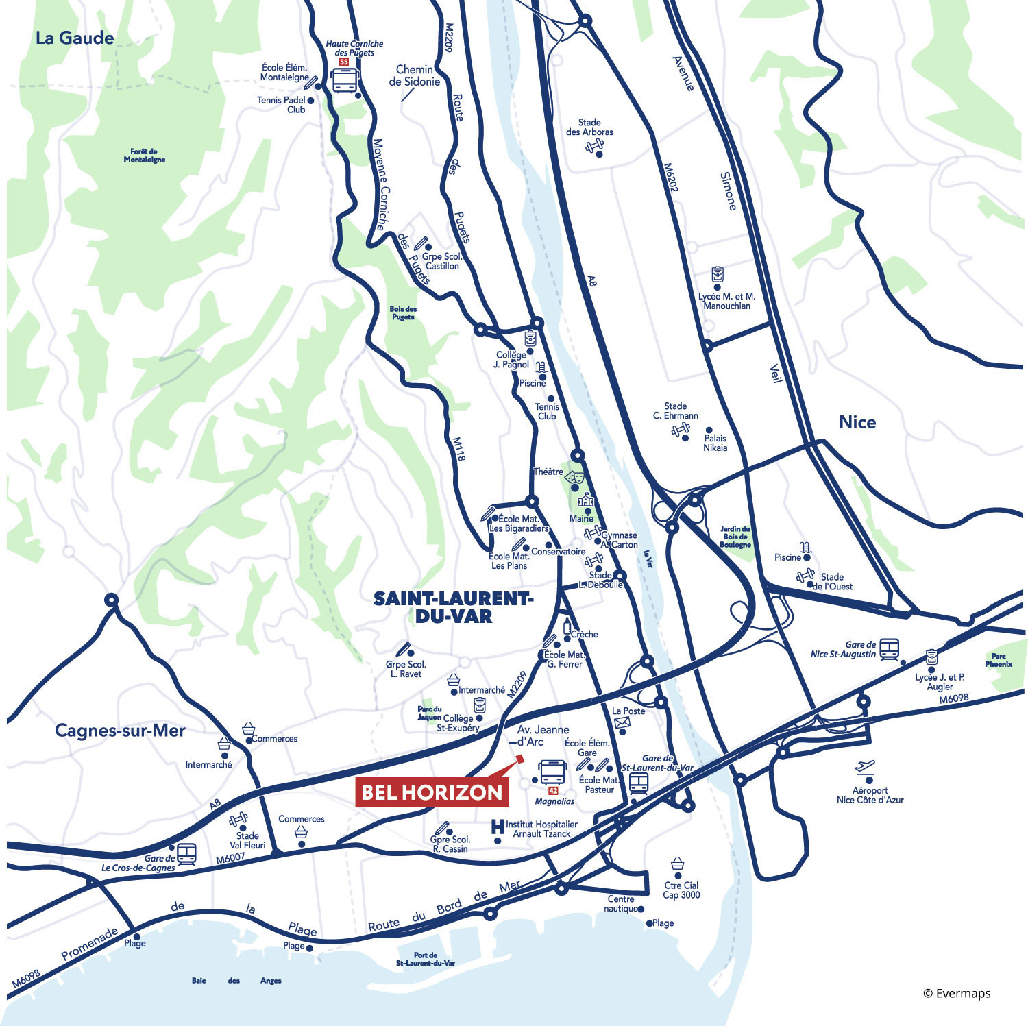 Entre centre-ville et plages, la résidence « Bel Horizon » profite d’un emplacement recherché, à proximité immédiate des commerces, écoles et services. Les plages, le port et CAP 3000 sont accessibles en moins de 5 minutes(a) en voiture.