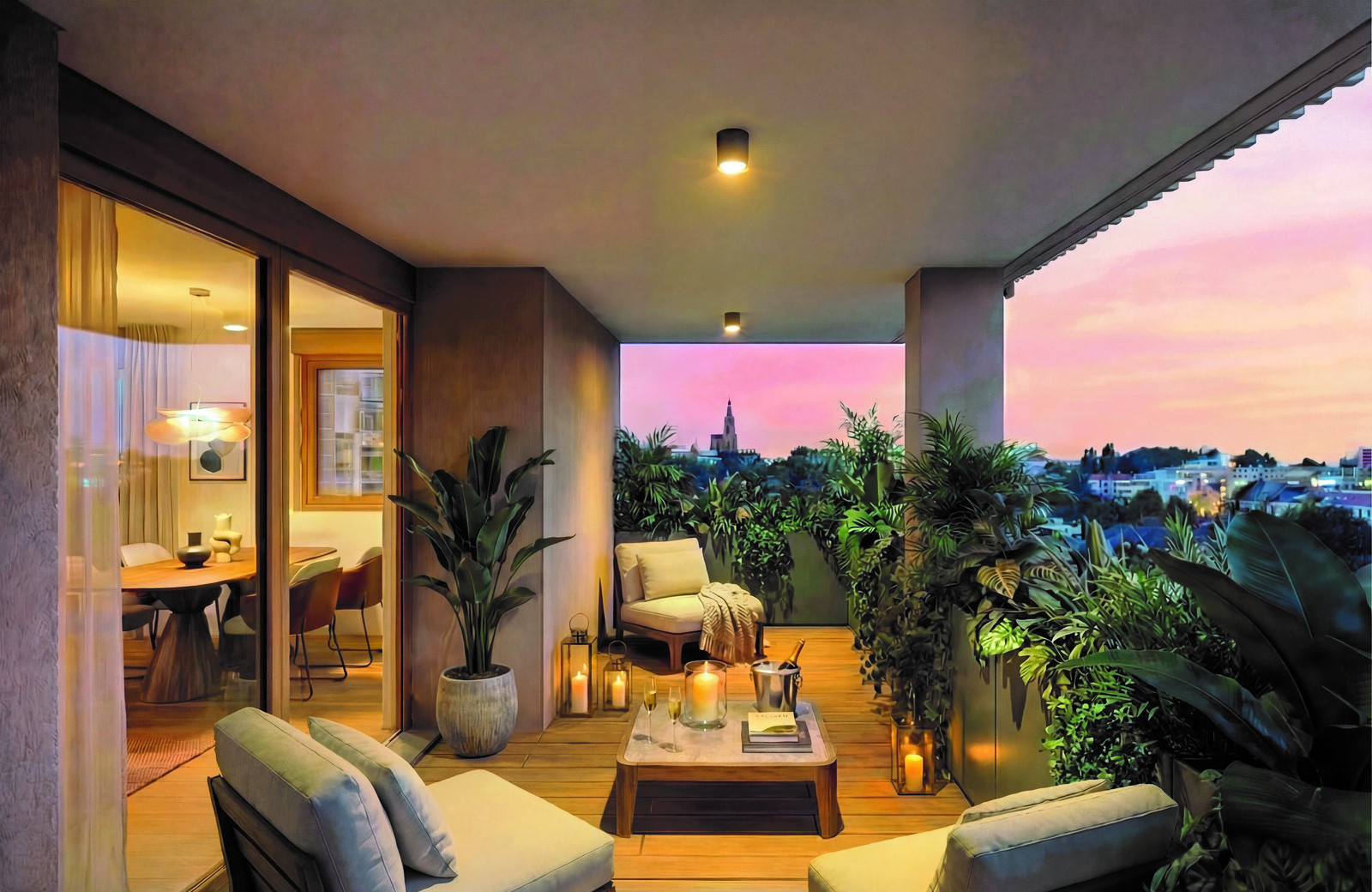 Les appartements s’ouvrent sur des loggias intégrées à l’architecture, pensées comme de véritables prolongements du séjour. Végétalisées et protégées, elles participent au confort thermique, filtrent la lumière et créent une transition douce entre intérieur et extérieur. Depuis ces espaces privilégiés, les vues se déploient vers le grand paysage : la cathédrale de Strasbourg, les reliefs vosgiens, la Forêt-Noire au loin.