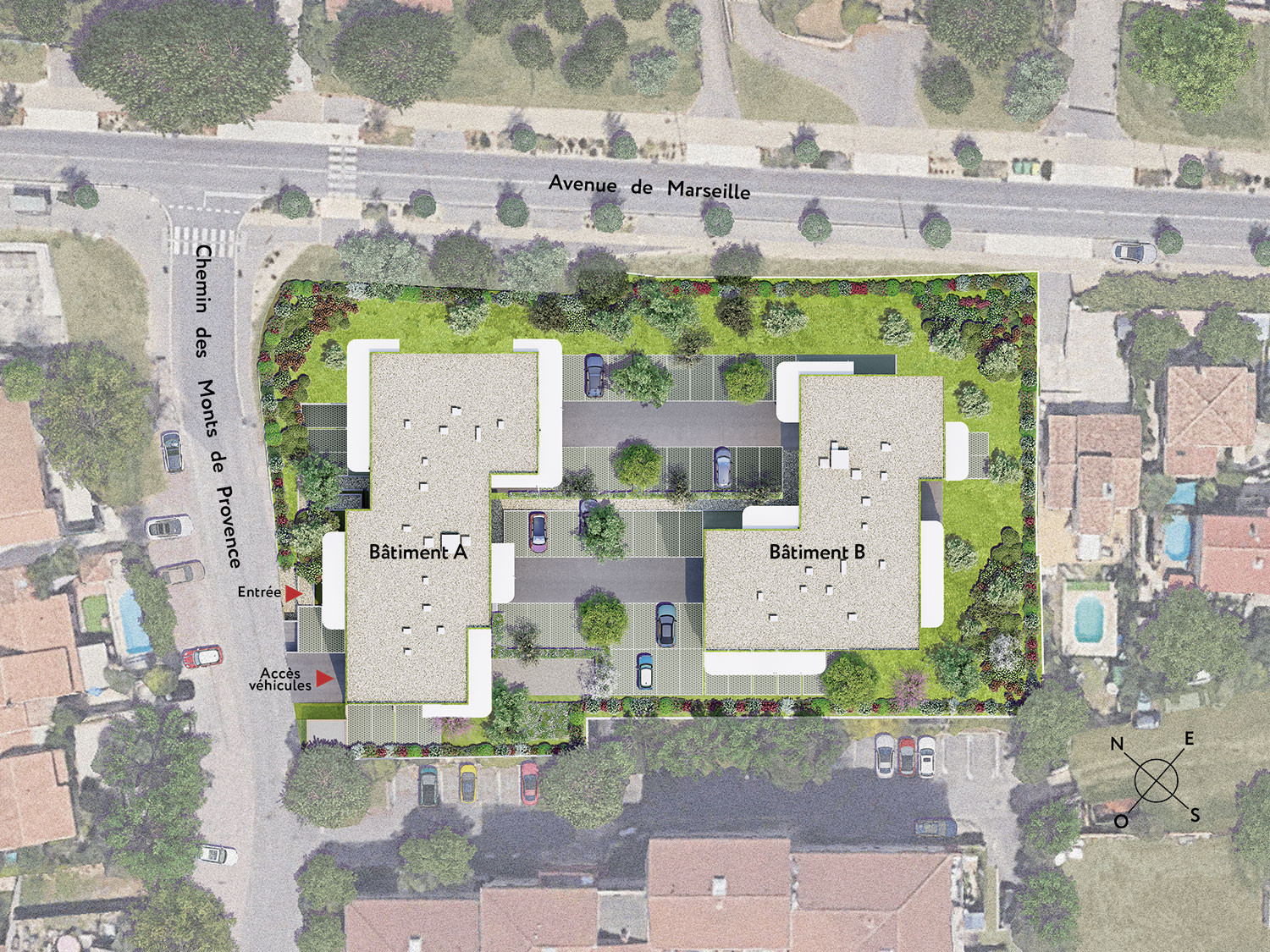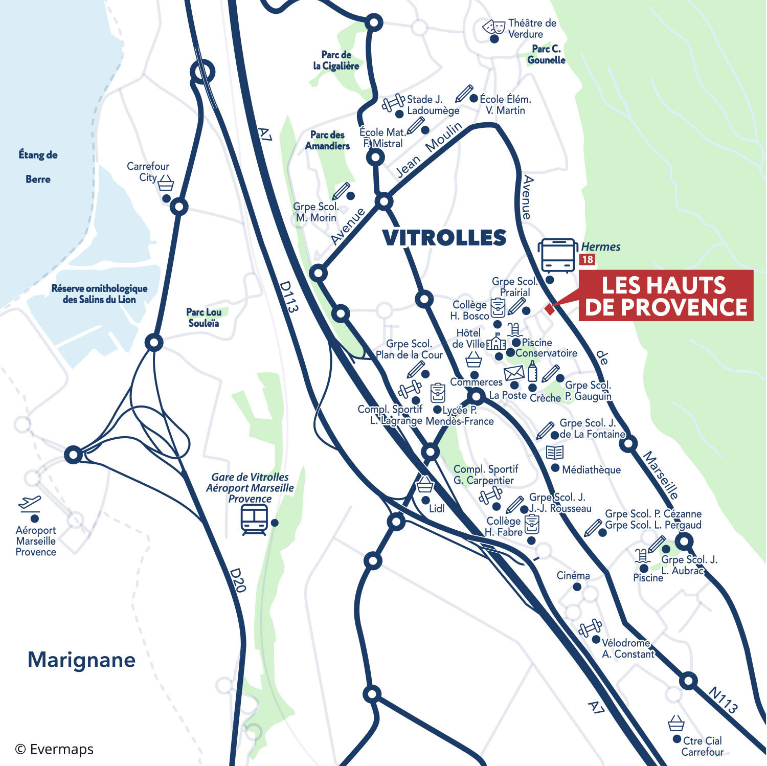 Située entre le centre historique de Vitrolles et la zone commerciale, la résidence bénéficie d’un emplacement pratique et stratégique, proche des commerces, écoles et transports. Elle est très accessible et bien desservie avec le bus à 2min à pied(a) et la gare TGV et l’aéroport à 10min(b).