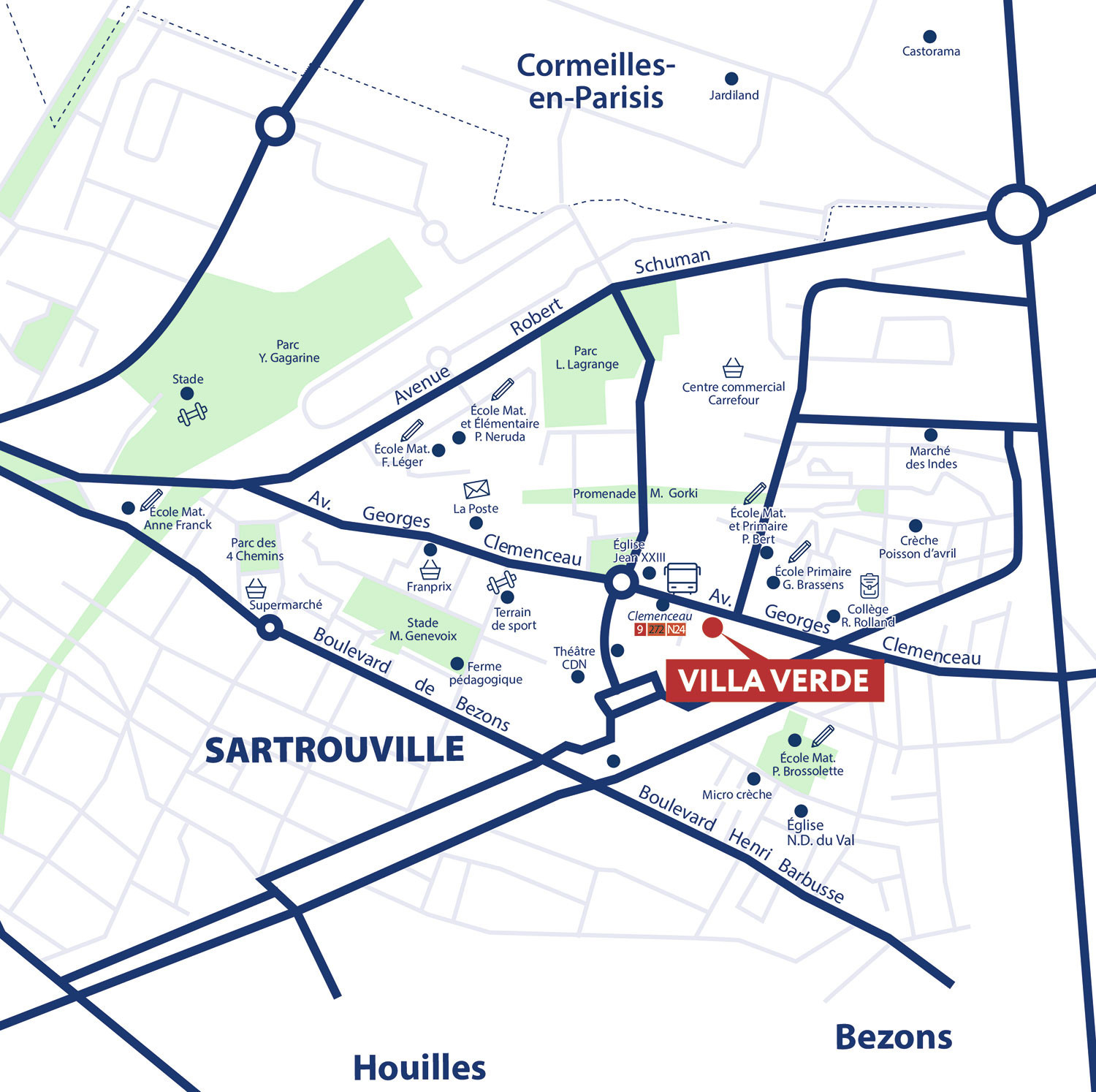 Située avenue Georges Clemenceau, la résidence s’insère dans un quartier pavillonnaire en plein développement. La résidence bénéficie de la proximité immédiate des commerces, des écoles et des lignes de bus, tous accessibles à pied. Entre quotidien fonctionnel et dynamisme du quartier, l’adresse allie confort et accessibilité.
