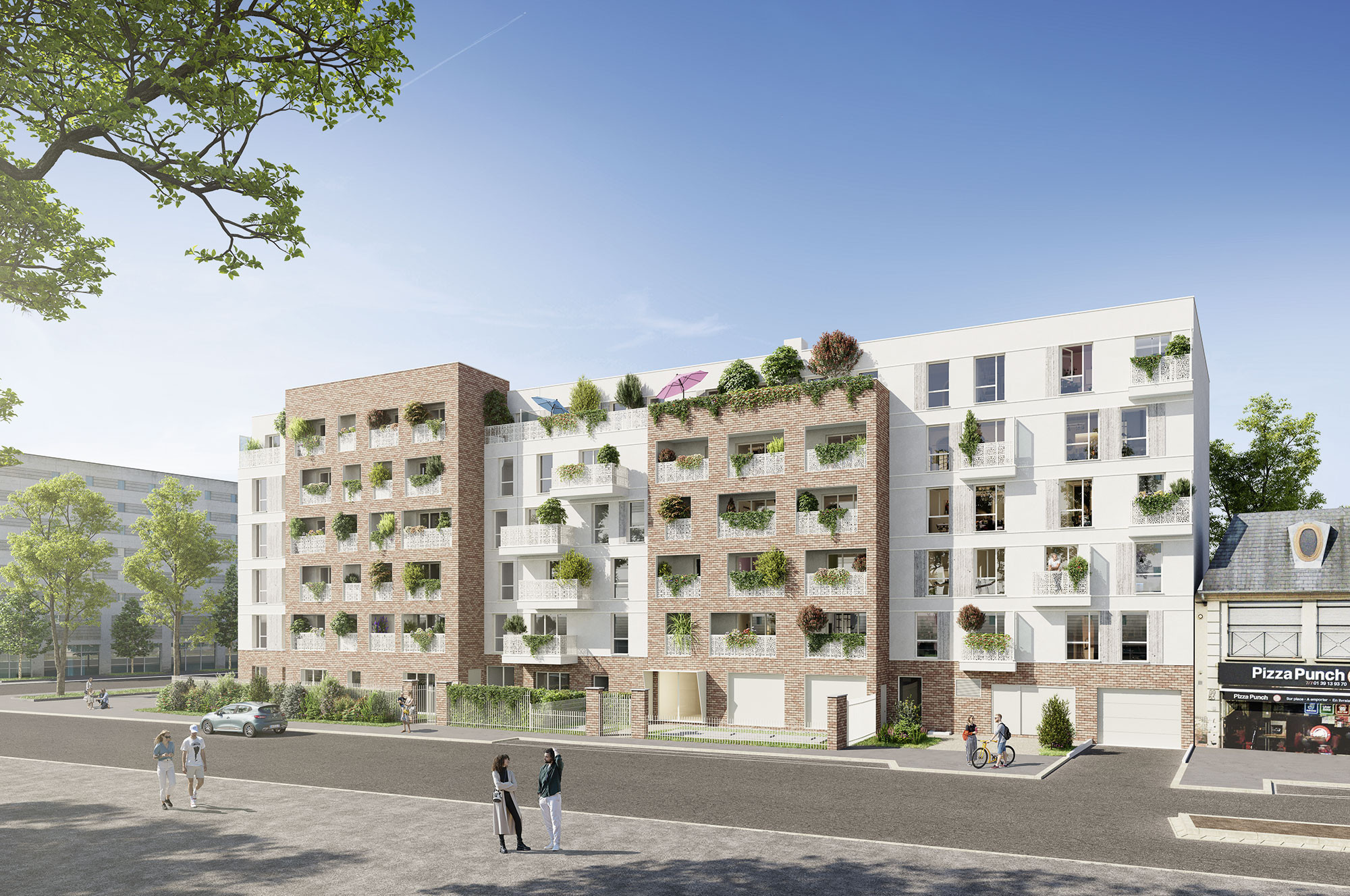Le projet se distingue par une architecture contemporaine marquée par des avancées en briquette en façade et un enduit clair en étages. La nature s’invite généreusement dans le projet, avec des espaces verts aménagés en cœur d’îlot comme en lisière de rue.