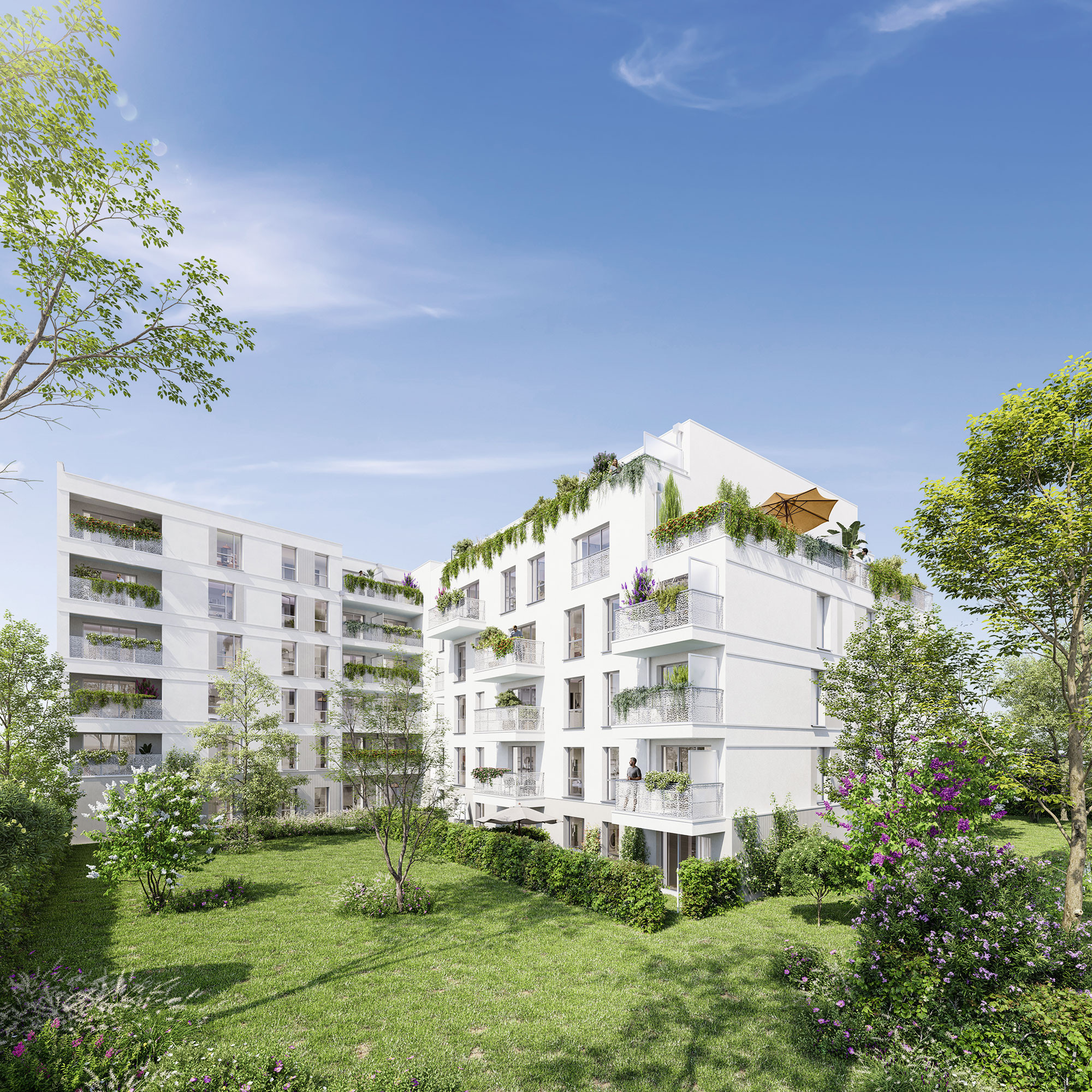 Tous les appartements s’ouvrent sur un espace extérieur privatif, majoritairement orientés est, ouest ou sud pour profiter de la lumière naturelle tout au long de la journée. Certains, en angle ou traversants, profite de vue dégagées sur le cœur d’ilot.
